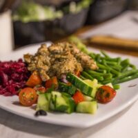 Goat’s cheese, beetroot, green salad, avocado, hummus with balsamic vinegar and olive oil. Served with homemade pitta bread (may contain sesame) -